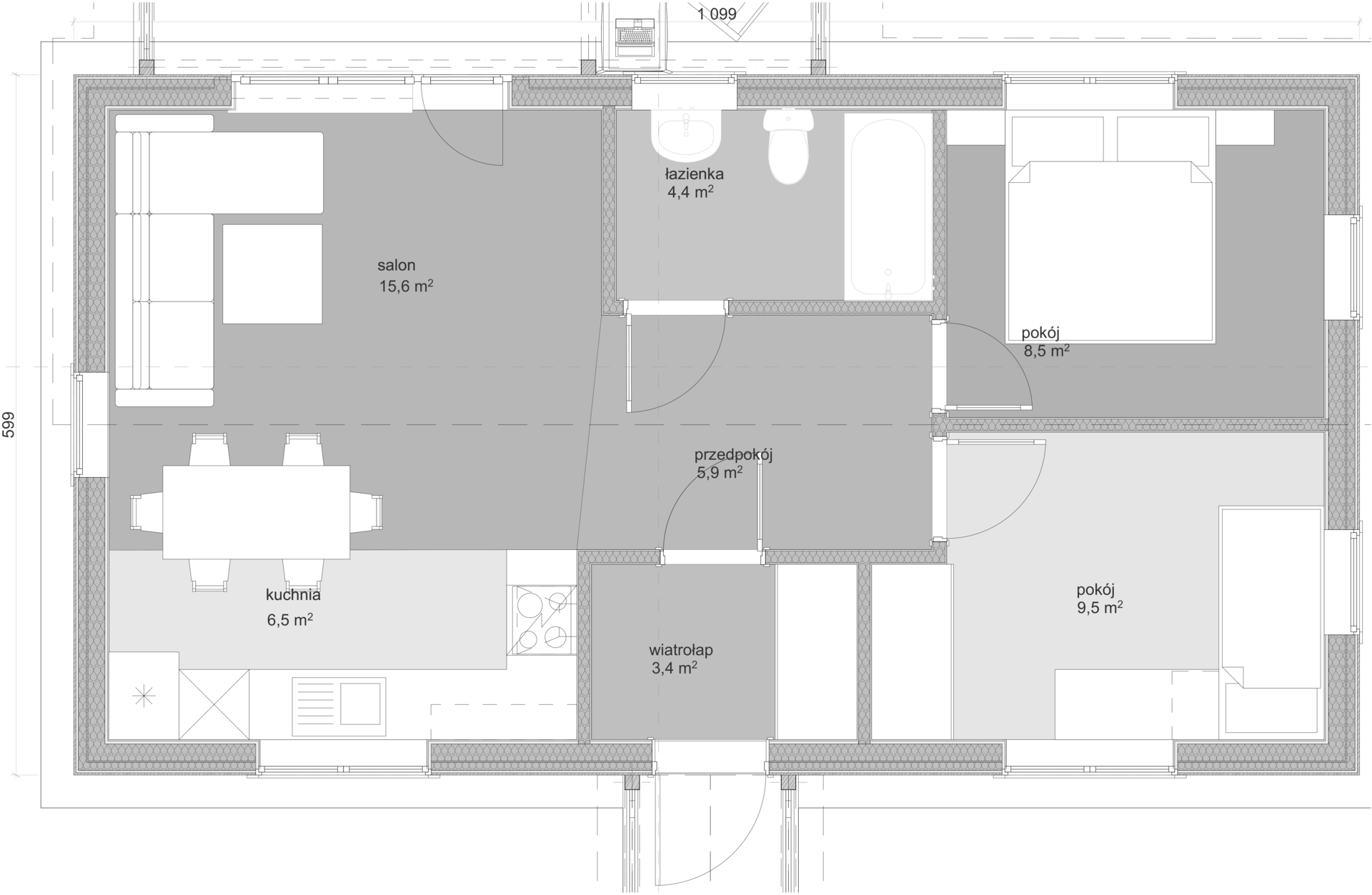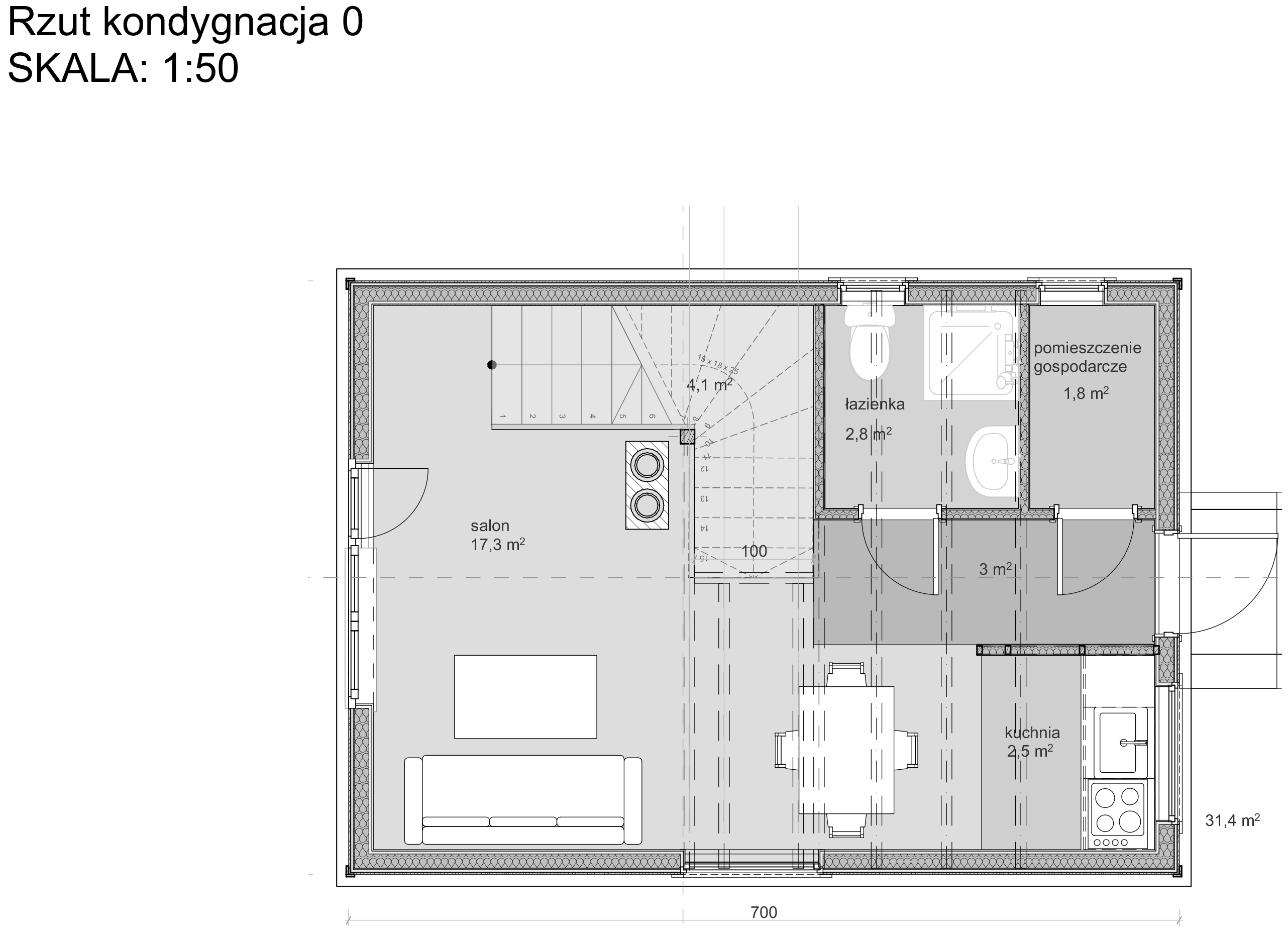 Standardowo 150-200 mm wełny mineralnej + wiatroizolacja i paroizolacja. Na życzenie dobieramy grubości pod warunki całoroczne.